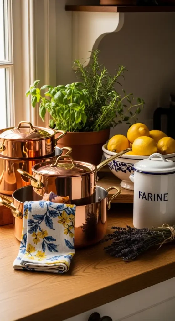 A collection of copper pots and pans is both practically excellent and visually extraordinary in a French kitchen. Copper’s warm glow against cream cabinetry or stone walls is one of the most beautiful material relationships in kitchen design. It doesn’t need to be a complete matched set — a collection assembled gradually over time, in different sizes and from different eras, is more interesting than a uniform set from a single manufacturer.