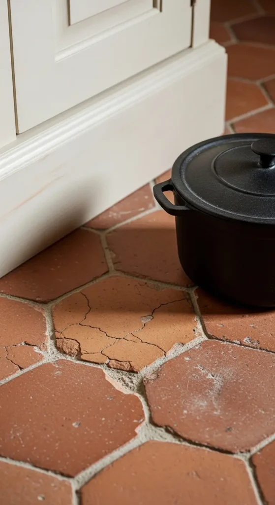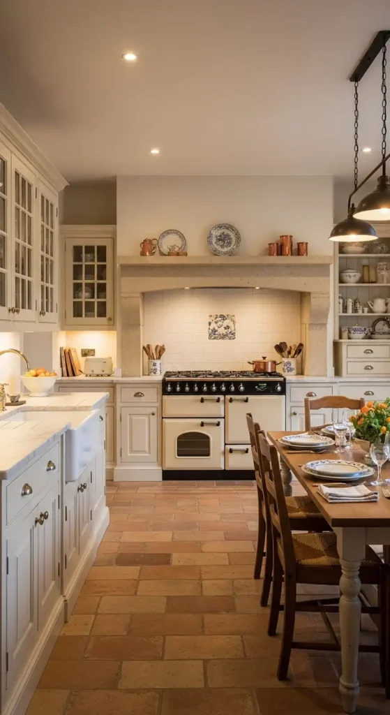 Handmade terracotta tiles are the most iconic flooring choice in French kitchen ideas with a Provençal influence. Their warm red-orange tones, slightly irregular surfaces, and genuine variation from tile to tile create a floor that reads as both rustic and sophisticated.