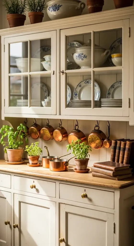 Glass-fronted cabinets: Rather than solid doors throughout, French kitchen cabinetry typically includes glass-fronted sections either clear glass or period-appropriate wire mesh that display the ceramics, glassware, and ingredients within as part of the kitchen’s visual composition.
