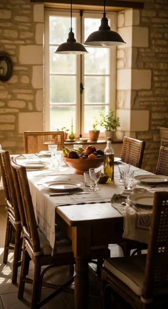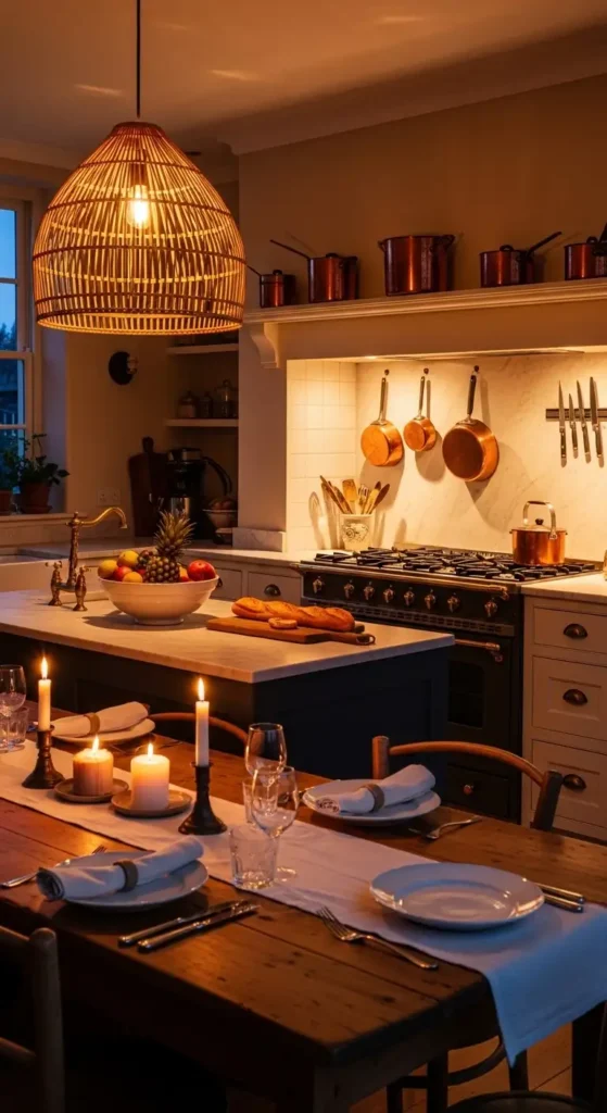 Layer your lighting: a statement pendant over the island or dining table in woven rattan, aged brass, or ceramic; warm under-cabinet LED strips (2700K) for task lighting; and candles or candlelight for atmosphere in the evenings. Maximise natural light wherever possible. Avoid cool-toned overhead fluorescent or LED lighting it destroys the warm atmosphere that is fundamental to the French kitchen aesthetic.