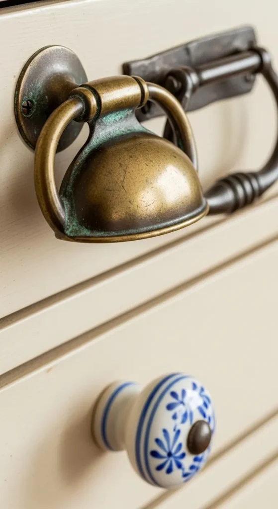 Change the hardware: Replacing all existing hardware with aged brass cup pulls and ceramic knobs costs very little and changes the kitchen’s character entirely.