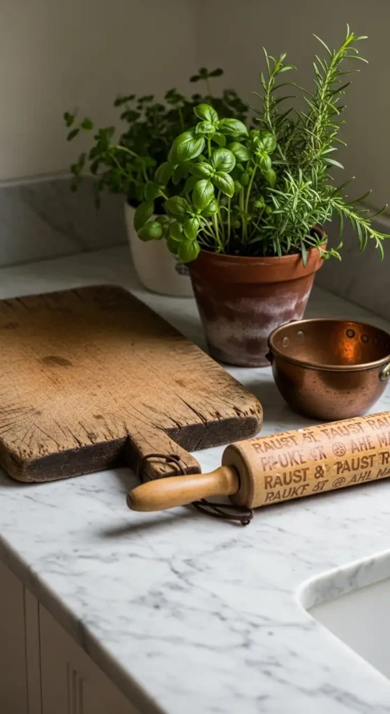 The honest truth about marble in kitchens is that it marks, stains, and etches. The French attitude is to accept this gracefully a well-used marble countertop with years of cooking evidence is more beautiful than a pristine one that nobody dared to use properly.