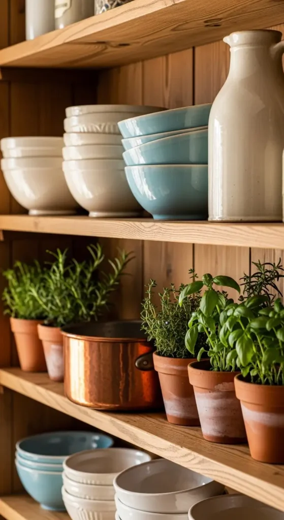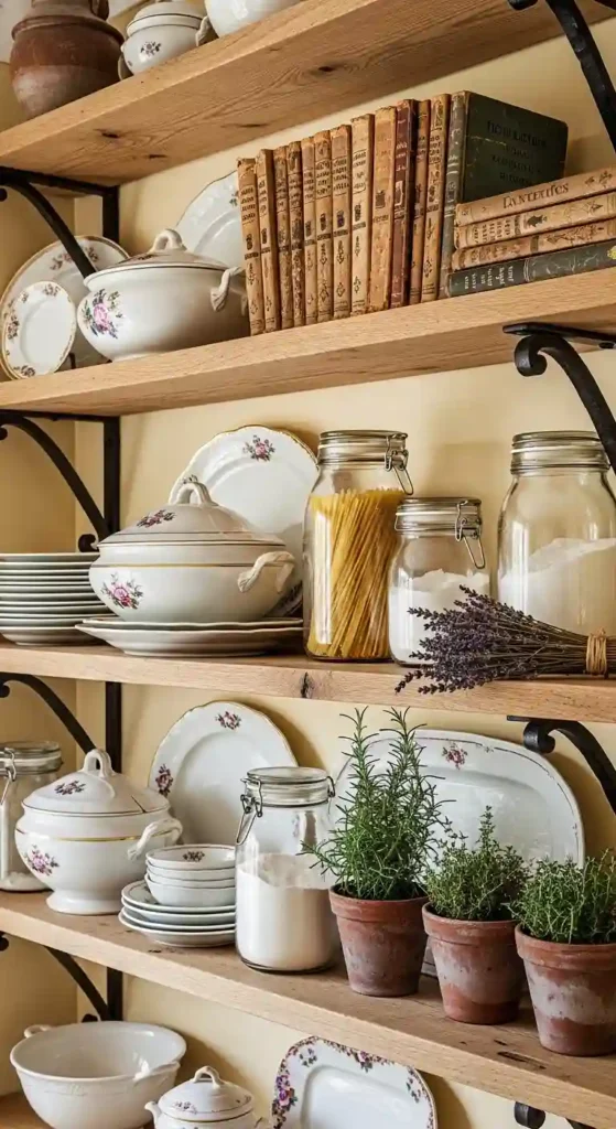 Display items that are beautiful, practical, and personal: a collection of ceramics in a limited colour family, vintage French storage jars, cookbooks arranged by height, fresh herbs in terracotta pots, copper cookware, dried lavender and botanicals, vintage wine glasses, and any antique French kitchen finds with personal meaning. The rule is simple: only display what you find genuinely beautiful.