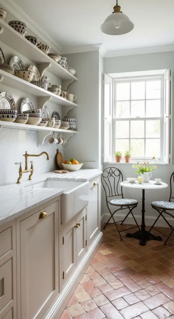 Open shelving works in a French kitchen because the items displayed are genuinely beautiful — and because they’re edited with care. The secret to open shelving that looks intentional rather than cluttered is curation: only display items that contribute to the visual composition.