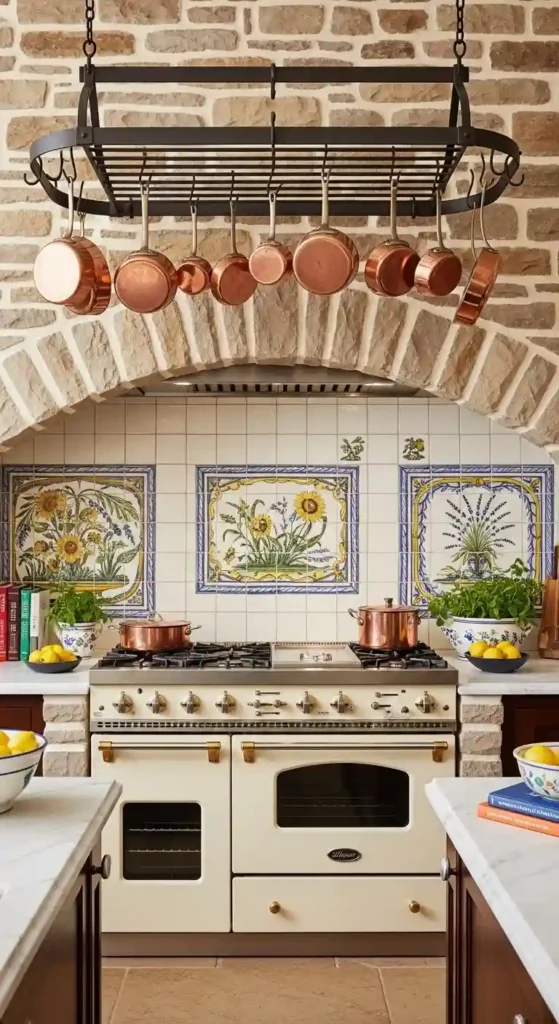 The French kitchen tradition embraces open storage, hanging pot racks, and the deliberate display of cooking implements, ceramics, and ingredients as an integral part of the kitchen’s visual identity. A row of copper pots hanging from a ceiling rack is both practical and beautiful. A collection of vintage Quimper pottery arranged on open shelves is functional storage and art simultaneously. This integration of the practical and the beautiful is one of the most distinctive and appealing aspects of French kitchen ideas.
