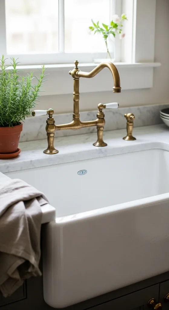 A large, deep, single-basin farmhouse sink in white fireclay is the most classically French choice. Belfast sinks are closely related and equally appropriate. Stone sinks carved from a single piece of limestone or granite are the most extraordinary option for those with budget for them. The tap should be in aged or unlacquered brass, ideally in a bridge or wall-mounted style.