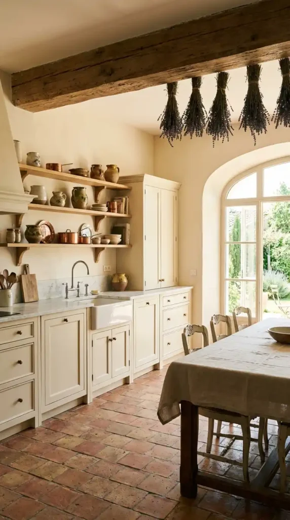 The Provençal Kitchen: Larger, warmer, more rustic. Exposed stone walls, terracotta tiles, heavy wooden beams, lavender and herbs growing in abundance, and a sense that this kitchen has been feeding families for centuries. Think farmhouse in the South of France with a view of sunflower fields.