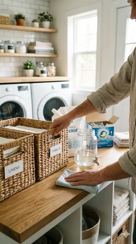 The one-in-one-out rule simply means you do not buy a new laundry product until the old one is finished. This applies to everything: detergents, softeners, treatments, dryer sheets. When you run out, you buy one replacement. This discipline, combined with decanting supplies into matching containers, keeps the visual clutter from accumulating.