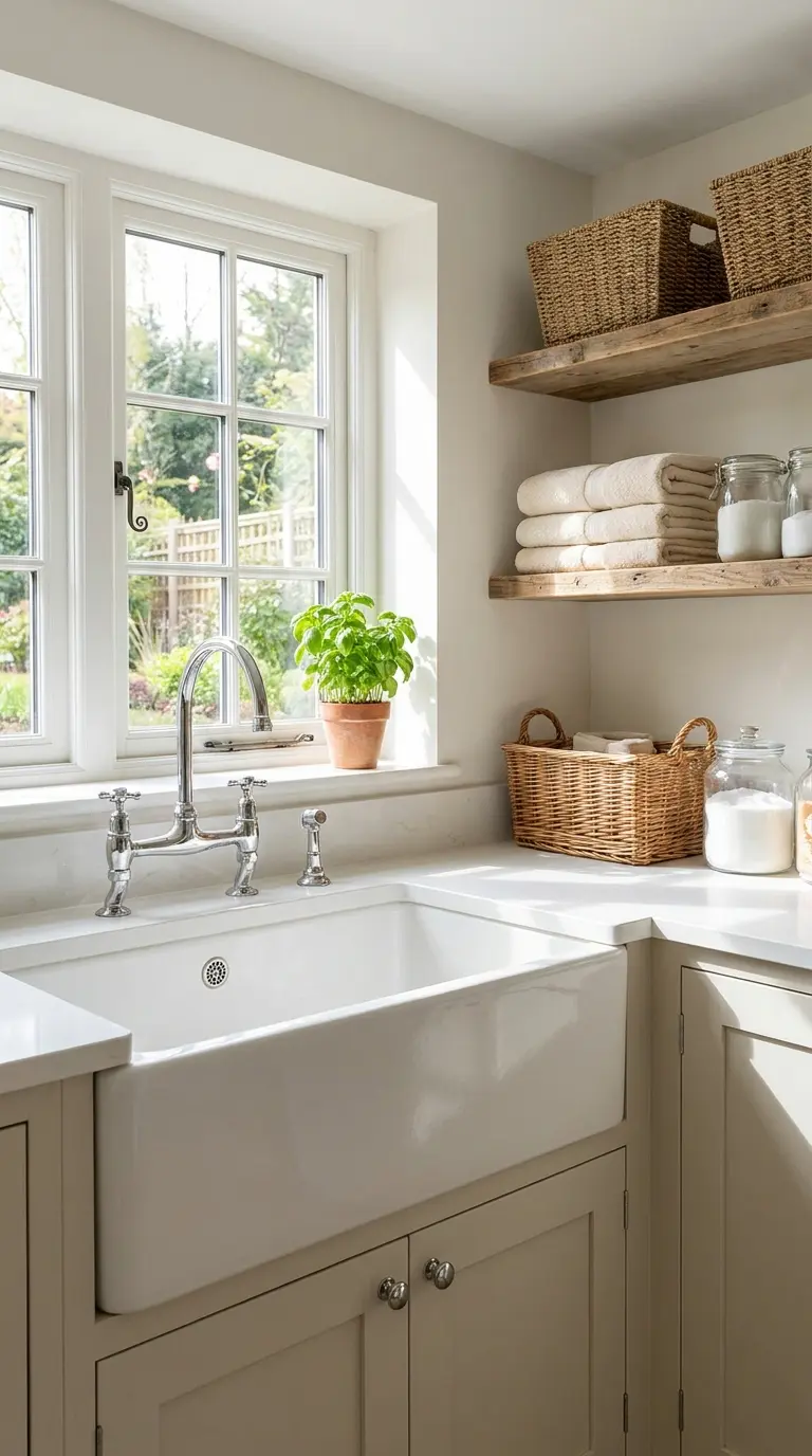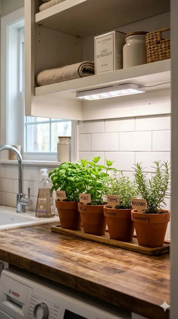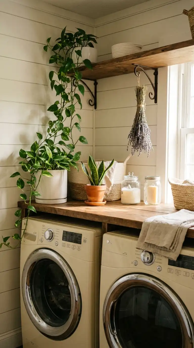 Choose low-light tolerant plants if your laundry room lacks a window: pothos, spider plants, peace lilies, and snake plants all tolerate low light conditions well. If you do have natural light, herbs in small pots — rosemary, basil, thyme — serve double duty as decoration and practical kitchen supplies.