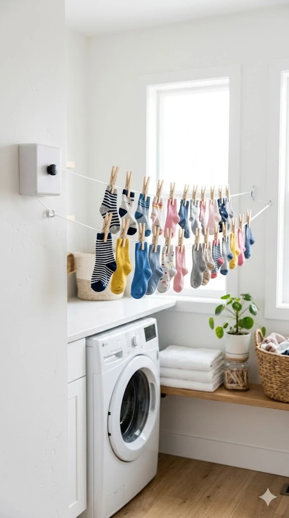 Idea 49: Add a retractable clothesline between two walls or between wall hooks for occasional indoor line drying.