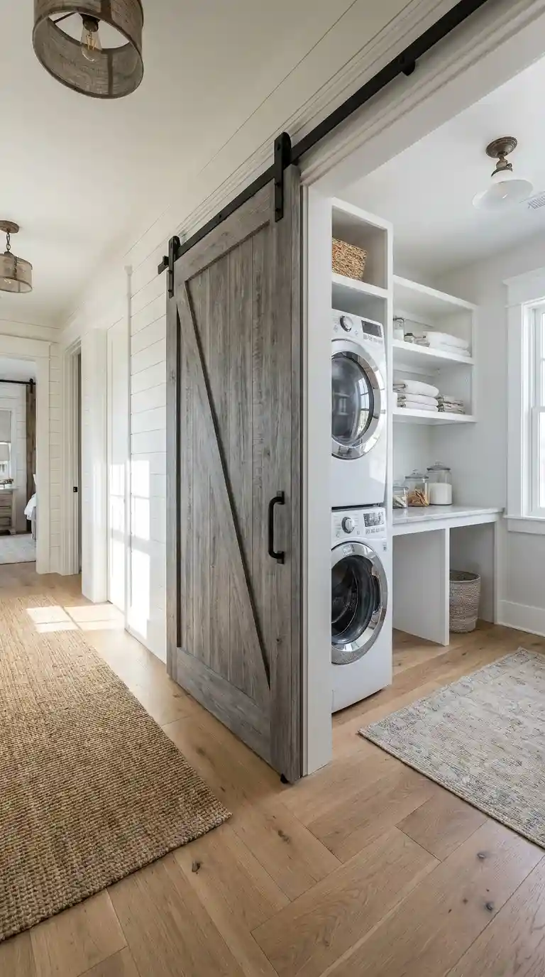 A sliding barn door is one of the most popular laundry room ideas in recent years, and it deserves its popularity because it genuinely solves multiple problems at once. It conceals the laundry area elegantly when you want the space to disappear, it slides rather than swinging so it does not require clearance, and it adds significant visual character to what is otherwise a plain utility space.