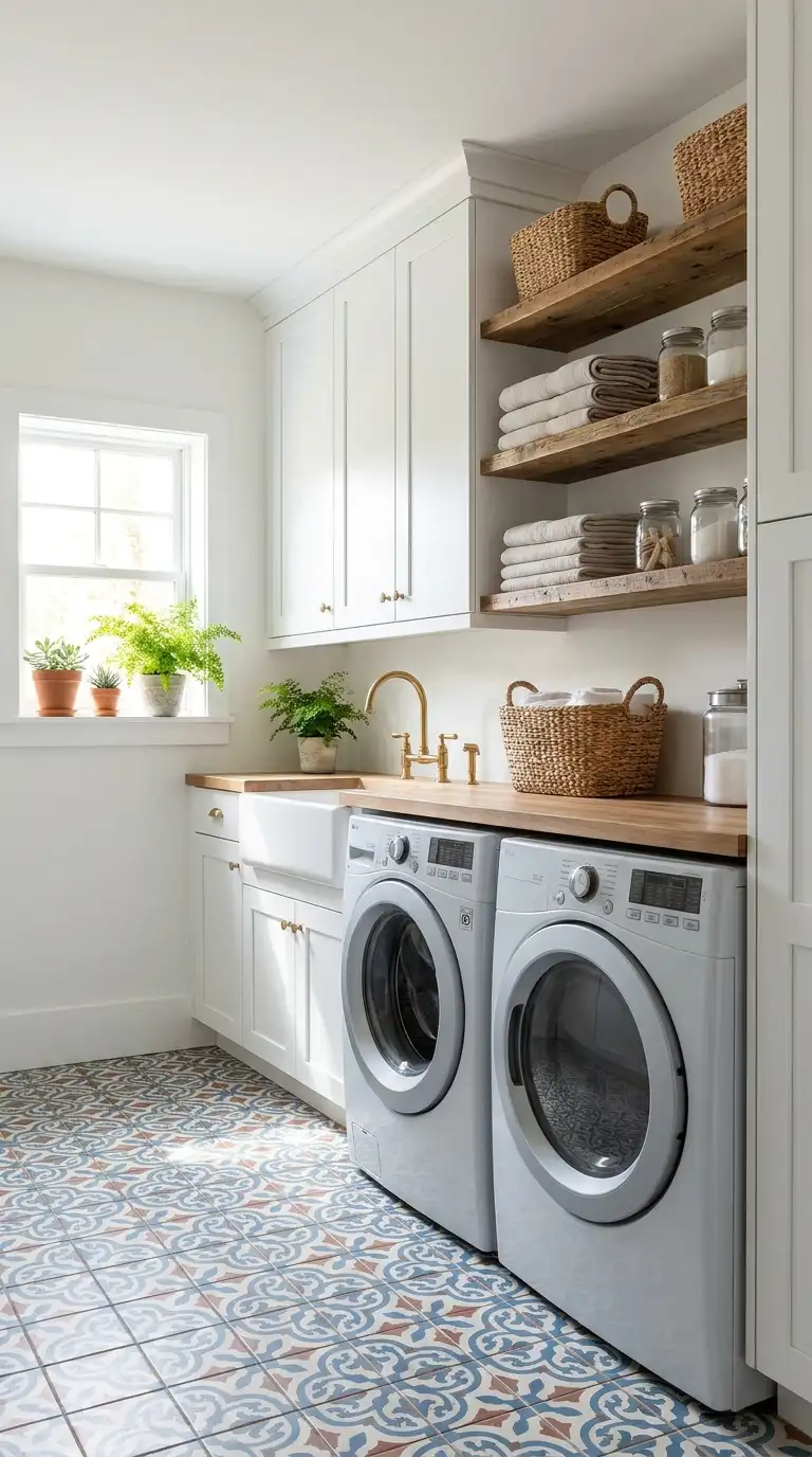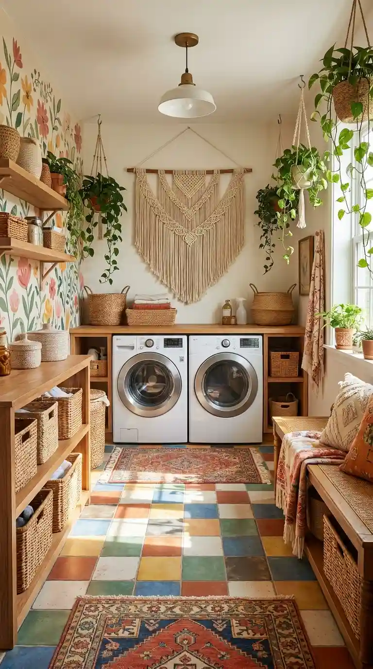 A boho laundry room leans into texture, pattern, and a collected-over-time feel that is the opposite of the sleek contemporary aesthetic. Macrame wall hangings, rattan storage baskets, mismatched vintage tiles on the floor, a painted mural on one wall, and plants everywhere this style turns the laundry room into a space with genuine personality and warmth.