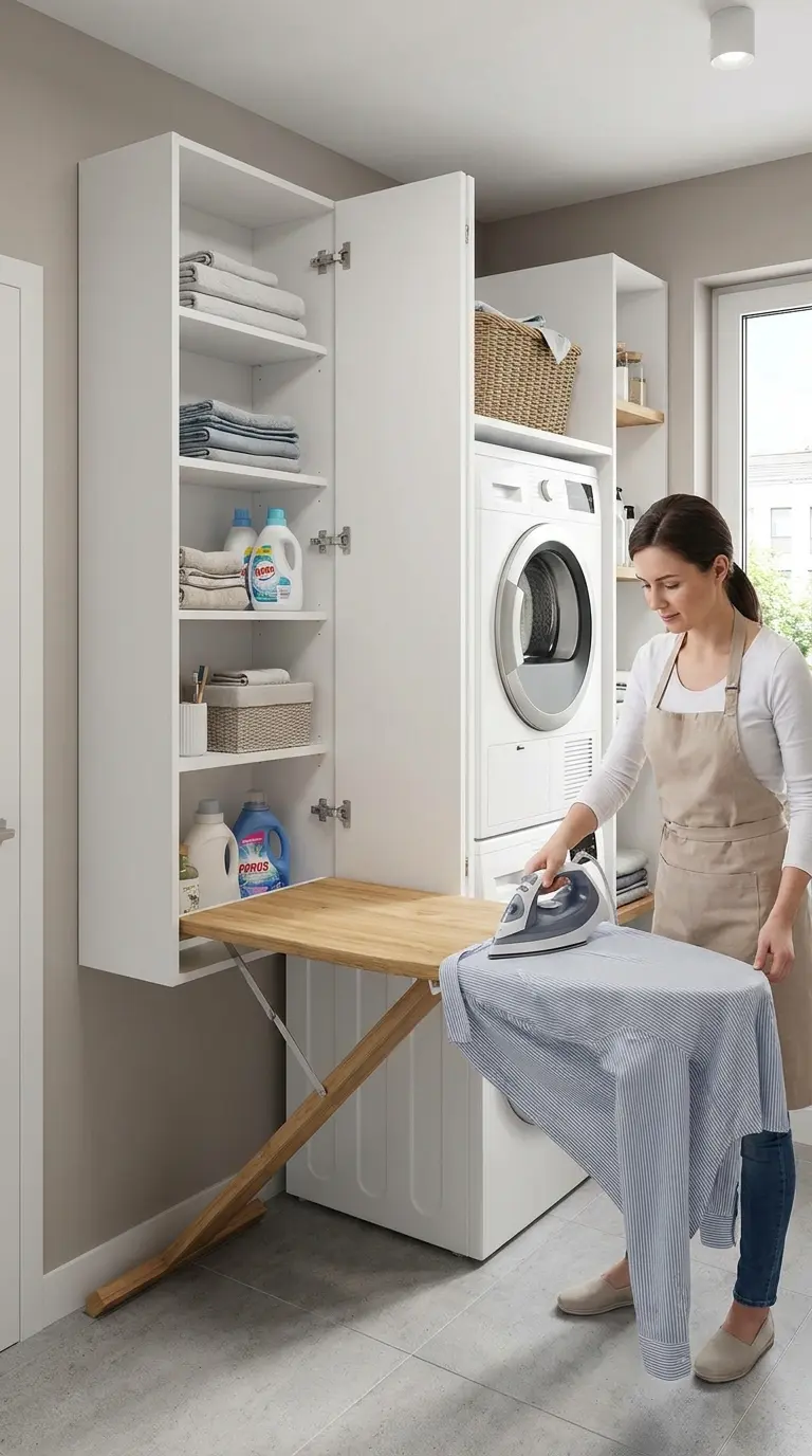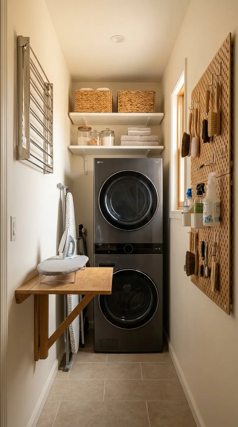 A fold-down wall-mounted ironing board is one of the most space-saving laundry room ideas available. When not in use, it folds flush against the wall and takes up essentially no space. When you need it, it unfolds in seconds to give you a full-size ironing surface. These can be found at most home improvement stores for around thirty to eighty dollars and install relatively easily with a drill and wall anchors.
