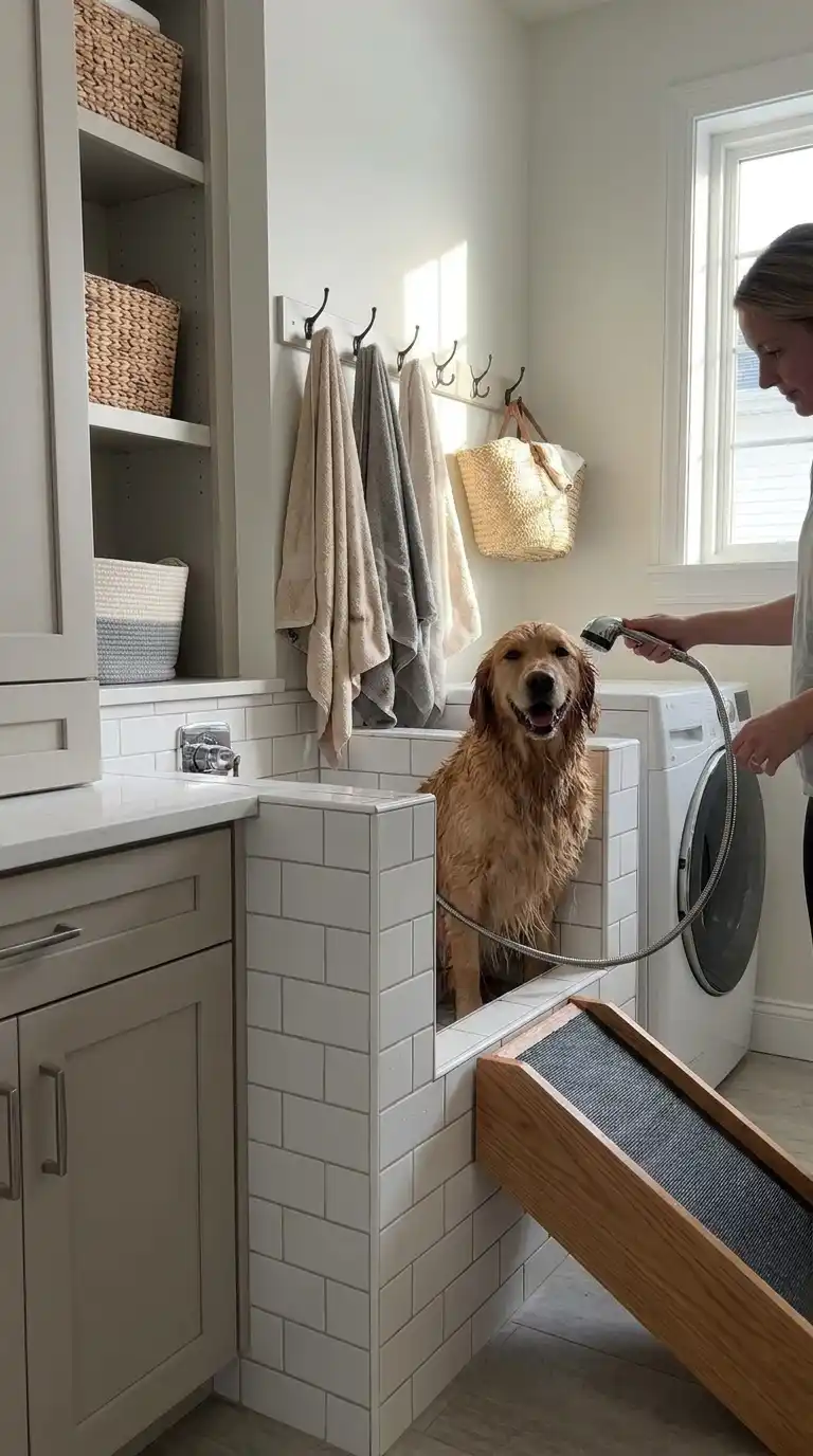 The laundry room is actually the ideal location for dog bathing — it is already equipped with water lines, drainage, and easy-clean surfaces. After a bath, the towels go straight into the washing machine. It is an elegant, practical solution that keeps the mess contained in the most appropriate room of the house.