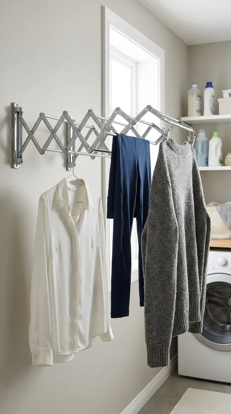 A wall-mounted retractable drying rack is one of those laundry room ideas that solves a problem most people did not know could be solved: where to put things that cannot go in the dryer. A retractable rack extends when needed and collapses flat against the wall when not in use, taking up no floor space and very little wall space. Some models hold up to 40 pounds of laundry and extend three to four feet from the wall.