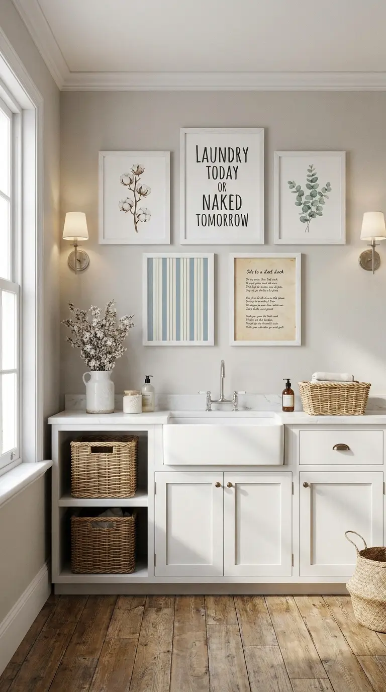 Hanging a small gallery wall in the laundry room is one of those ideas that sounds slightly silly until you do it, and then it makes the room genuinely fun to be in. Prints with laundry-related sayings the classics like ‘Lost Socks Department’ or custom typography prints add personality and humor. Mix in some botanical prints or abstract pieces for a gallery wall that feels curated rather than themed.