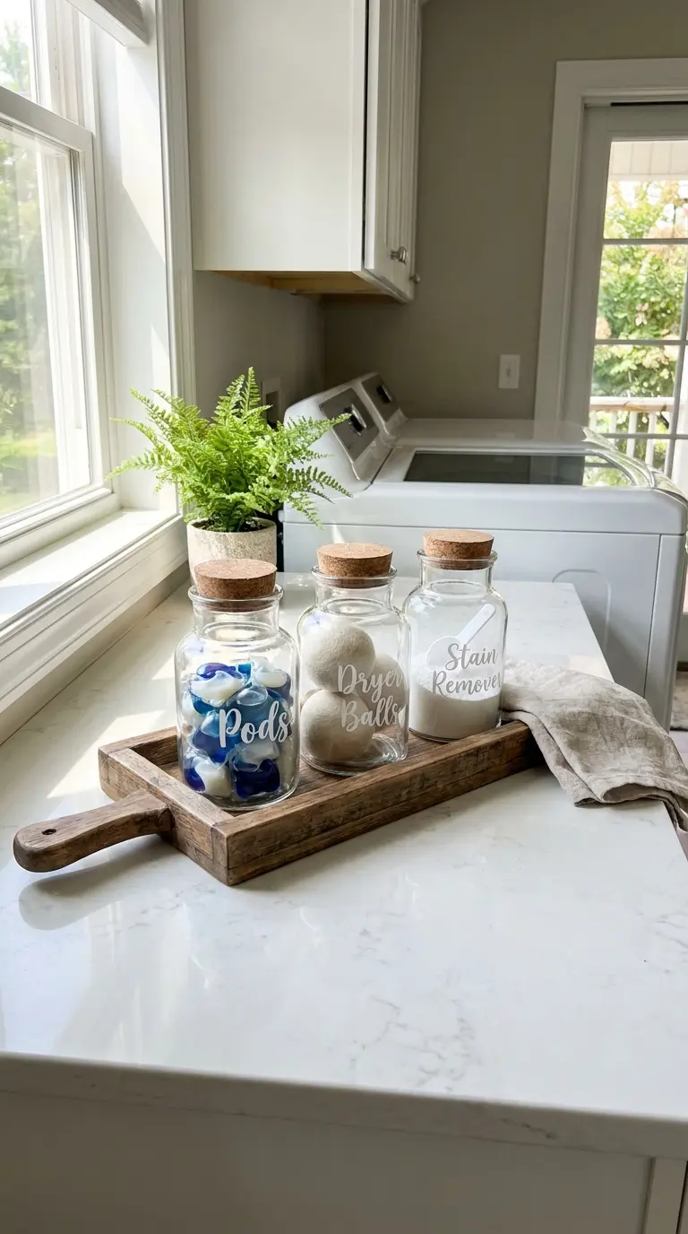 Decanting laundry supplies into matching glass or acrylic jars might feel like an unnecessary step, but it makes a genuine difference to the visual feel of the room and the ease of use. Bulk detergent pods, dryer balls, and stain-fighting additives stored in clear labeled containers look intentional and organized rather than cluttered. They also make it easy to see at a glance when supplies are running low.