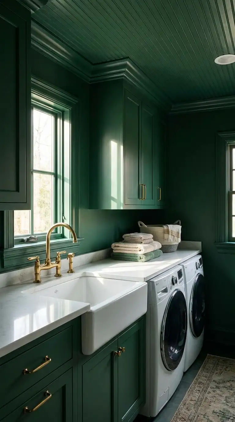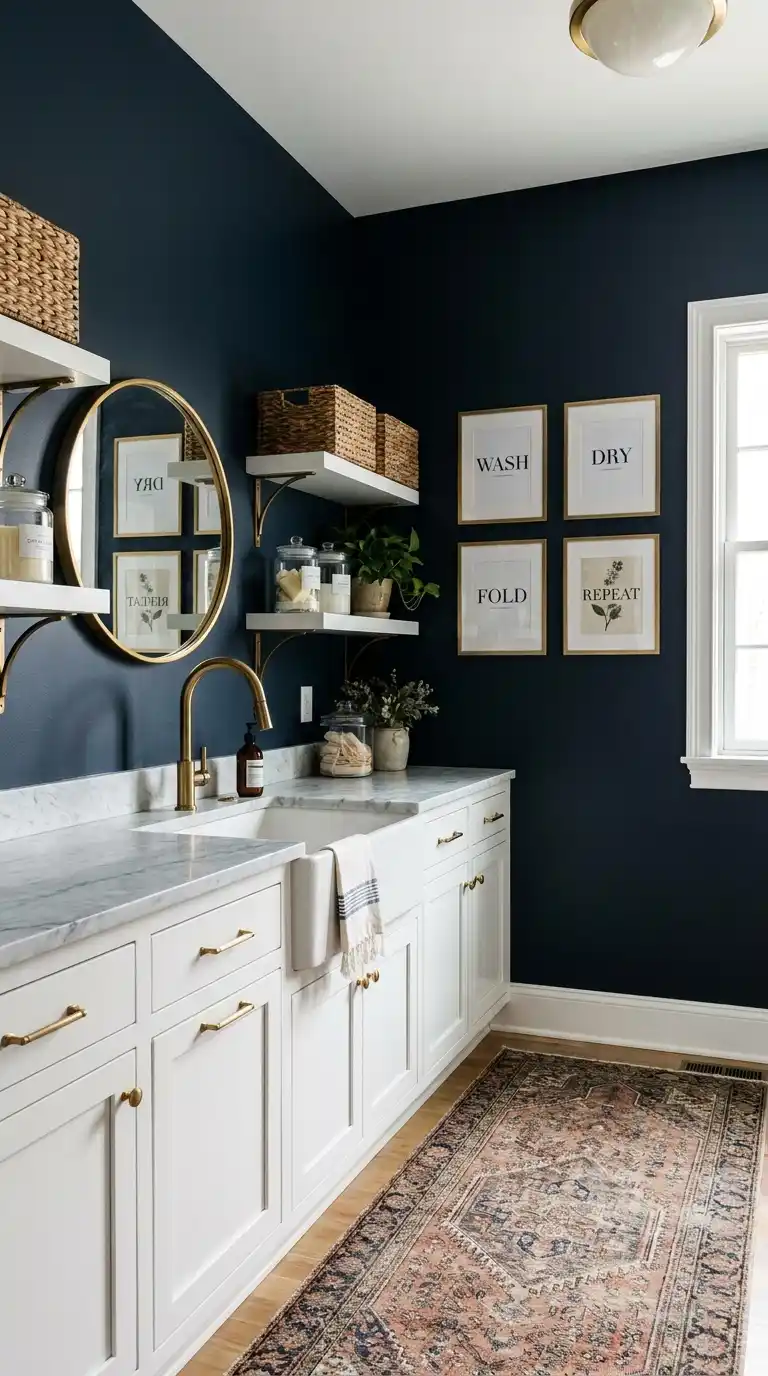 It sounds counterintuitive to use dark colors in a small room, but color drenching creates a jewel-box effect that makes the space feel intentional and dramatic rather than cramped. Add brass or gold hardware and fixtures for warmth, and the result is a laundry room that looks like it was designed by someone with far more budget than was actually spent.