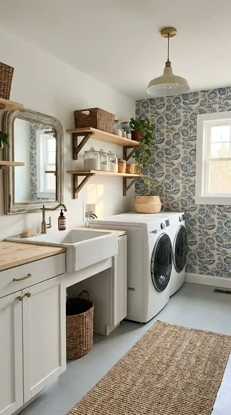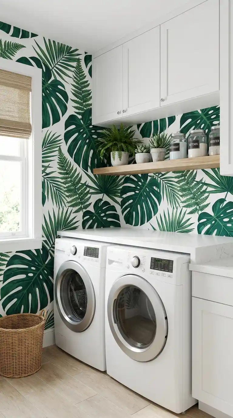 Peel-and-stick wallpaper has genuinely improved in quality over the past several years, and a laundry room is one of the best places to use it because the stakes feel low. A bold floral pattern, a geometric print, or a classic stripe on the wall behind the washer and dryer adds instant personality to the space without any permanent commitment. If you get tired of it, it peels off cleanly.