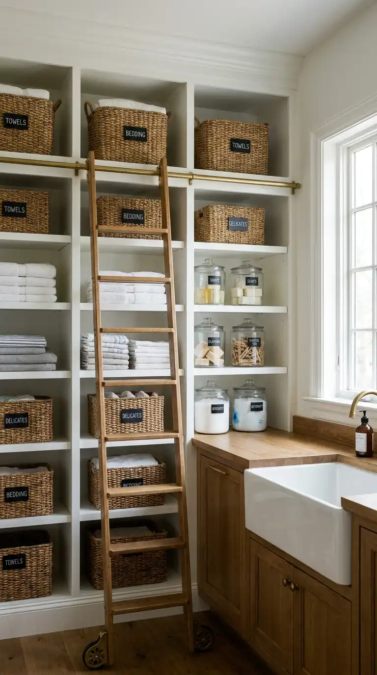 Label each basket clearly using chalkboard labels, tags, or printed labels in a consistent font. Categories might include: wool delicates, sports clothes, cleaning cloths, rags, or items to donate. When everything has a designated basket, the room maintains its organized appearance with far less daily effort.