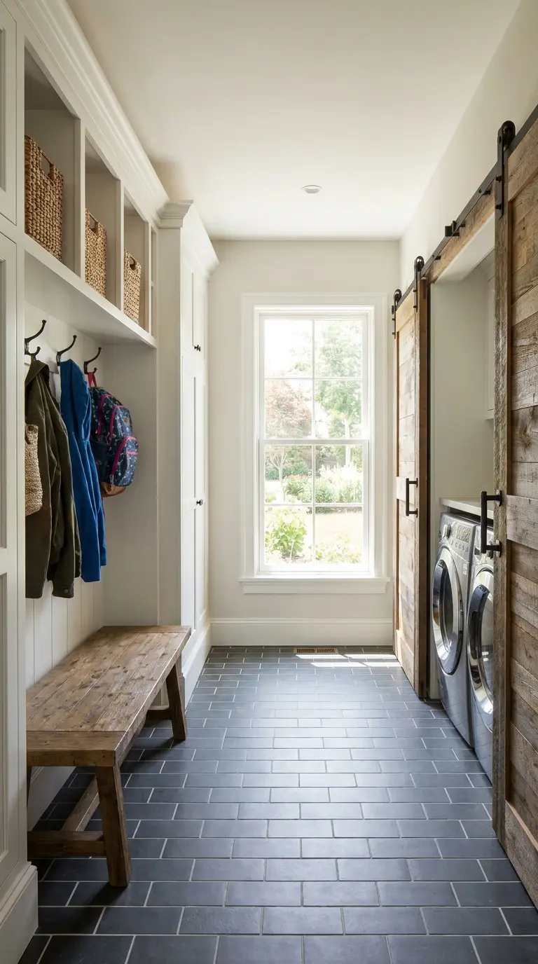 Combining a mudroom and a laundry room is one of the most practical laundry room ideas for families, and it has become increasingly popular in new home construction for good reason. The mudroom handles the entry chaos boots, backpacks, coats, sports gear and the laundry facilities handle the direct transition from outdoor clothes to clean ones. The two functions support each other perfectly.