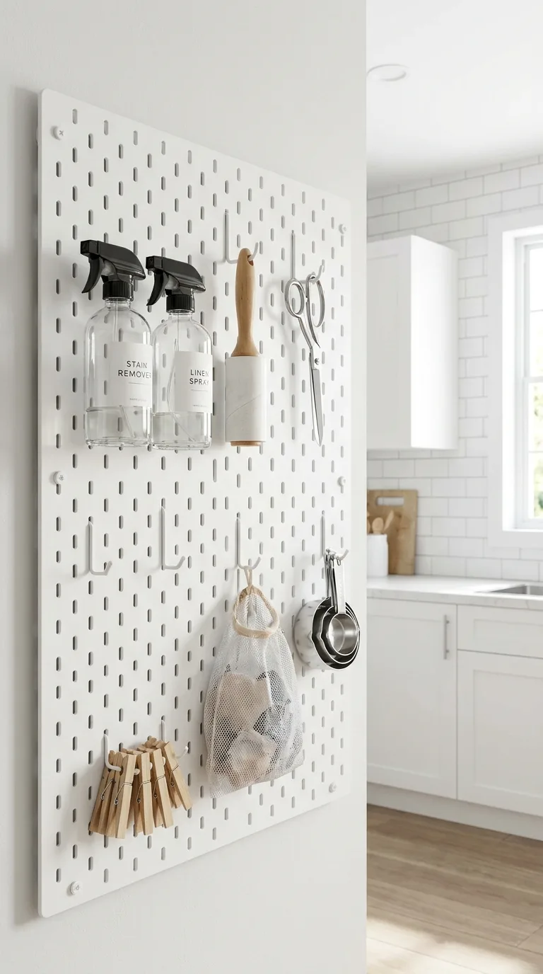 Pegboards are an underused storage solution in laundry rooms. Mounted on an empty wall, a pegboard with hooks and small bins holds an impressive array of laundry supplies without any shelves at all. Hang spray bottles, scissors, measuring cups for detergent, clothespins, and lint rollers in a way that keeps everything visible and within easy reach.