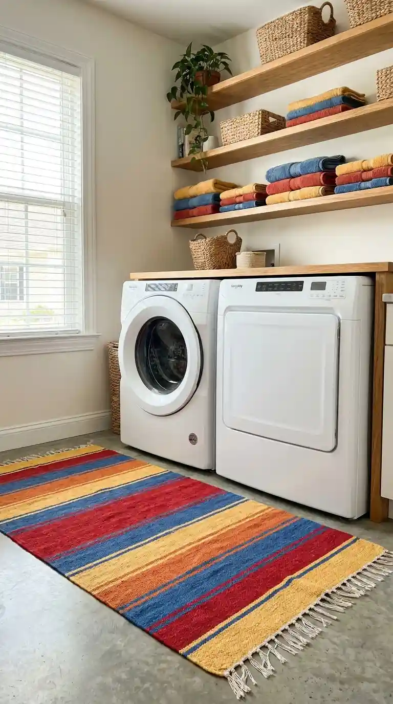 A washable rug in the laundry room is a simple, affordable touch that adds warmth and texture to what is often a very hard-surfaced, utilitarian space. A vintage-style flat-weave cotton rug or a striped jute rug introduces color and softness underfoot without costing much. The key word is washable — which, happily, is very easy to find when you are standing in front of a washing machine.