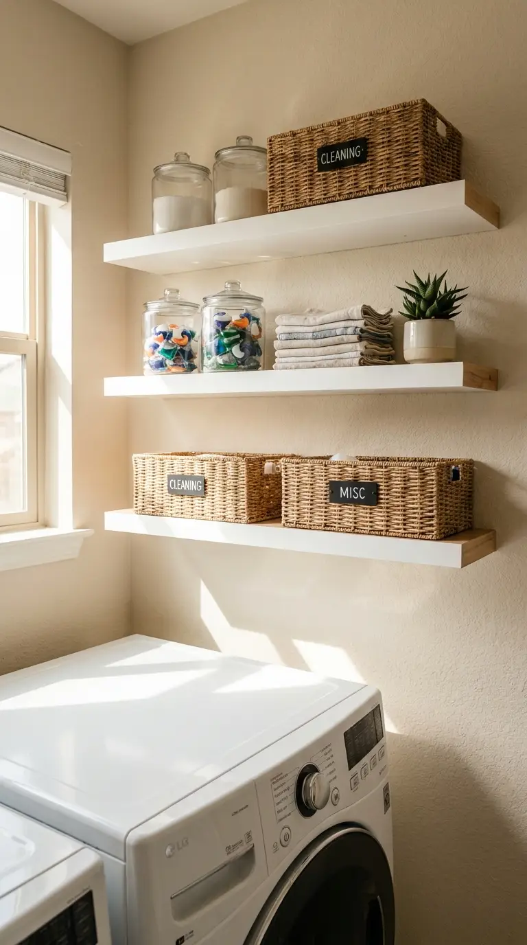 When floor space is scarce, the answer is almost always to look up. Wall-mounted shelves above your washer and dryer give you significant storage without using any floor space at all. Floating shelves in white or natural wood are affordable, easy to install, and instantly improve the look of the room. Use them for detergent, dryer sheets, stain removers, and baskets that hold smaller laundry accessories.