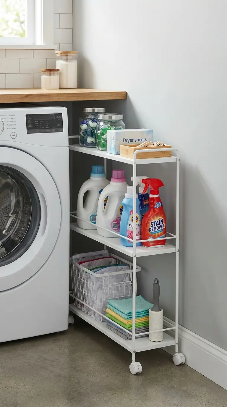 The gap beside your washer or dryer is valuable real estate that most people ignore. A slim rolling cart typically 4 to 6 inches wide fits perfectly in this gap and provides several shelves of storage for detergent, dryer sheets, stain sticks, and other small laundry supplies. These carts roll out for easy access and slide back in to keep the room looking neat.