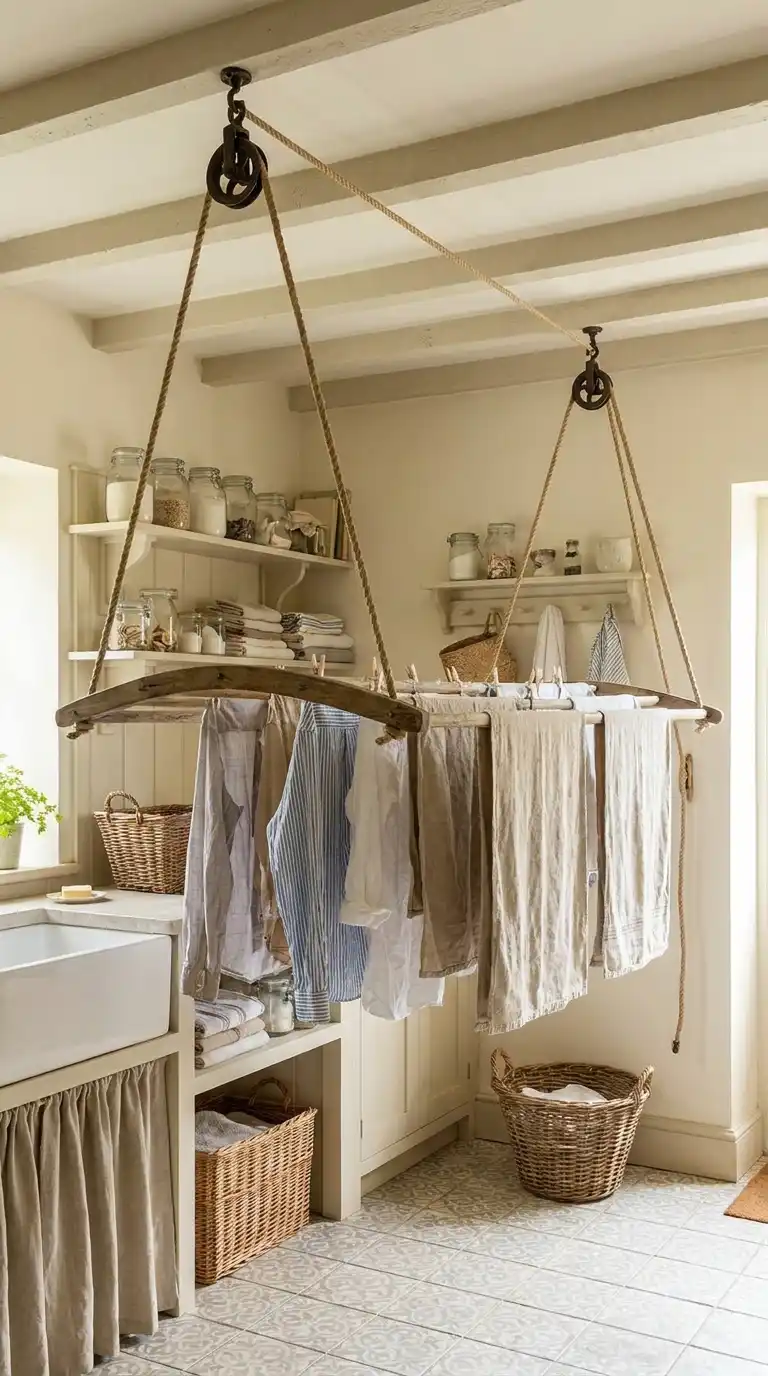 These systems are particularly useful in smaller rooms where floor or wall space for a drying rack is scarce. They are also a natural complement to a laundry room with good ceiling height — a feature that is often wasted in these spaces. Installation requires finding ceiling joists and using appropriate hardware, but the result is a functional, beautiful feature that most laundry rooms lack.
