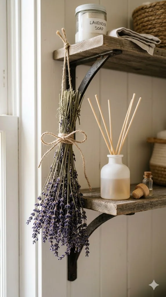 Idea 46: Add scent to the laundry room with a reed diffuser, a small candle on a high shelf, or dried lavender bundles tied to shelving.