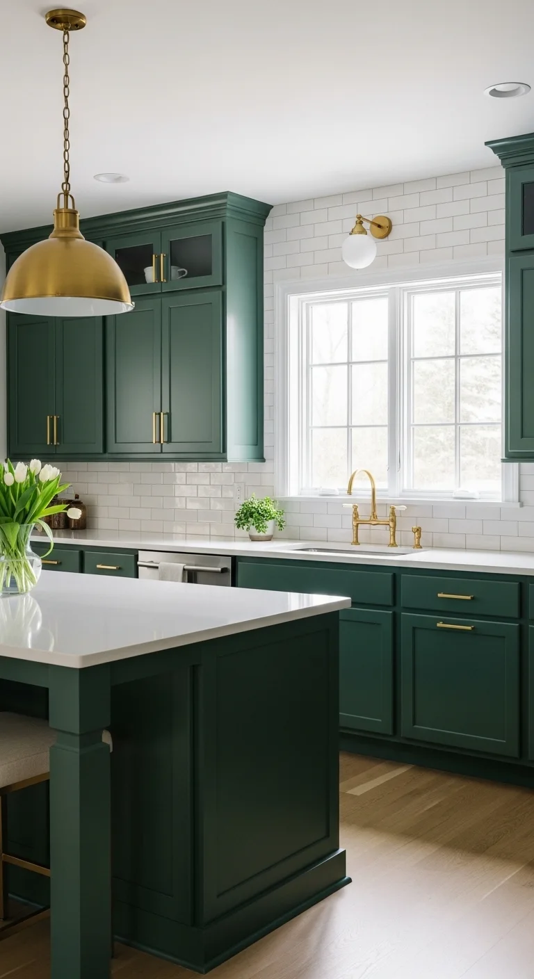 Emerald green paired with white creates a rich and refreshing look. This combination brings a touch of nature into your kitchen.