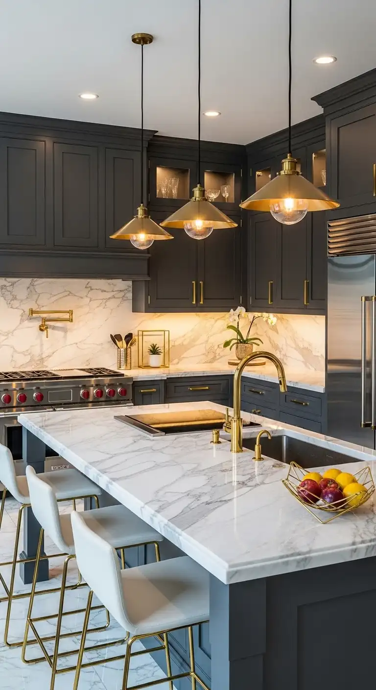 Marble countertops, gold hardware, and custom lighting add sophistication. Dark tones such as charcoal or navy combined with lighter shades create a high-end look.