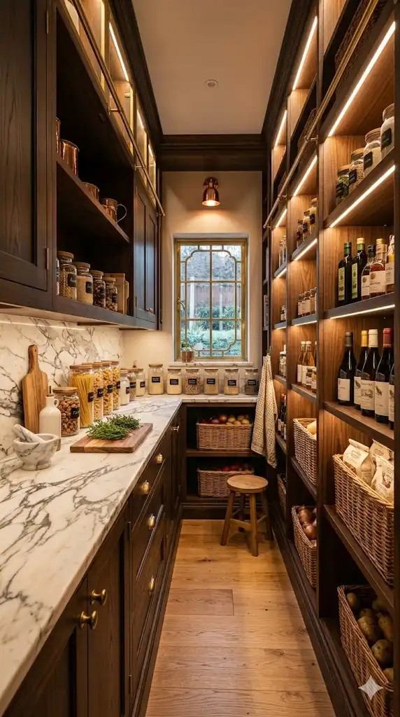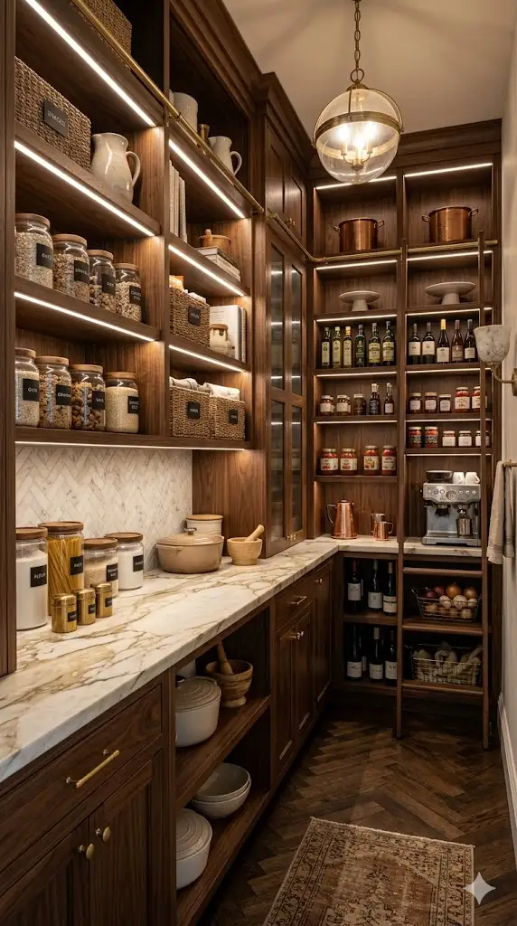 These details elevate basic walkin pantry ideas into high-end interior design concepts.