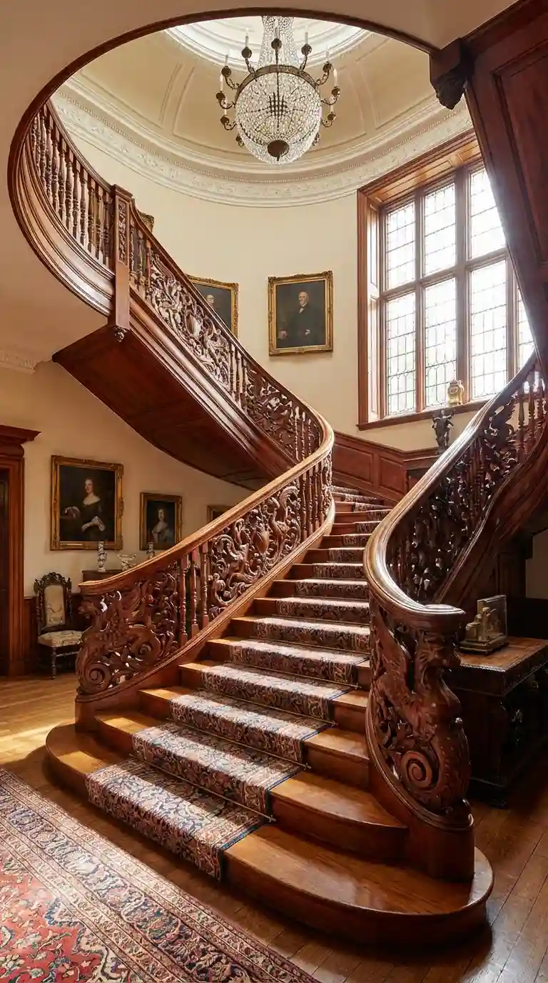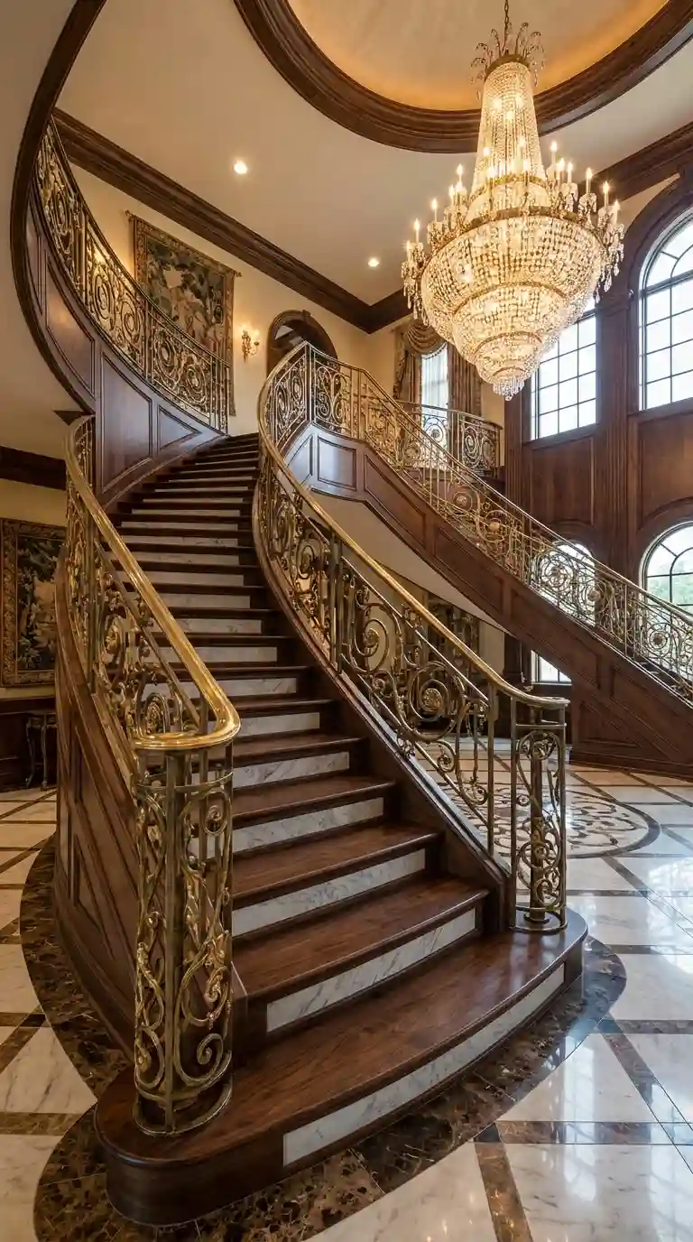 These designs often feature detailed balusters, rich wood tones like mahogany or cherry, and curved structures that feel grand and inviting.