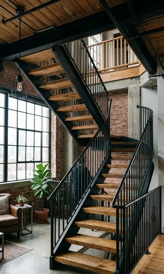 Another approach I’ve personally loved is combining wood with metal. A staircase with wooden treads and black steel railings creates a striking contrast. It feels modern, but not cold the wood keeps everything balanced.